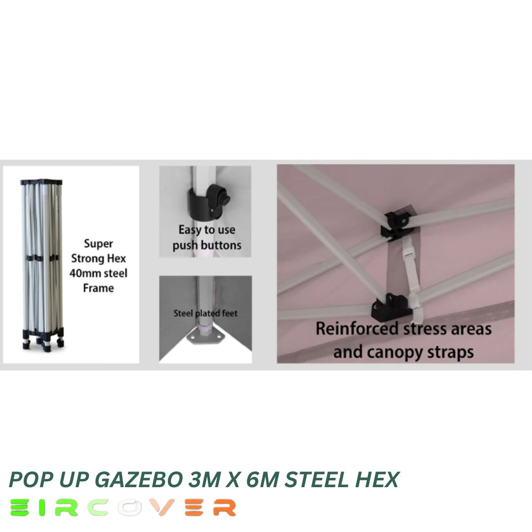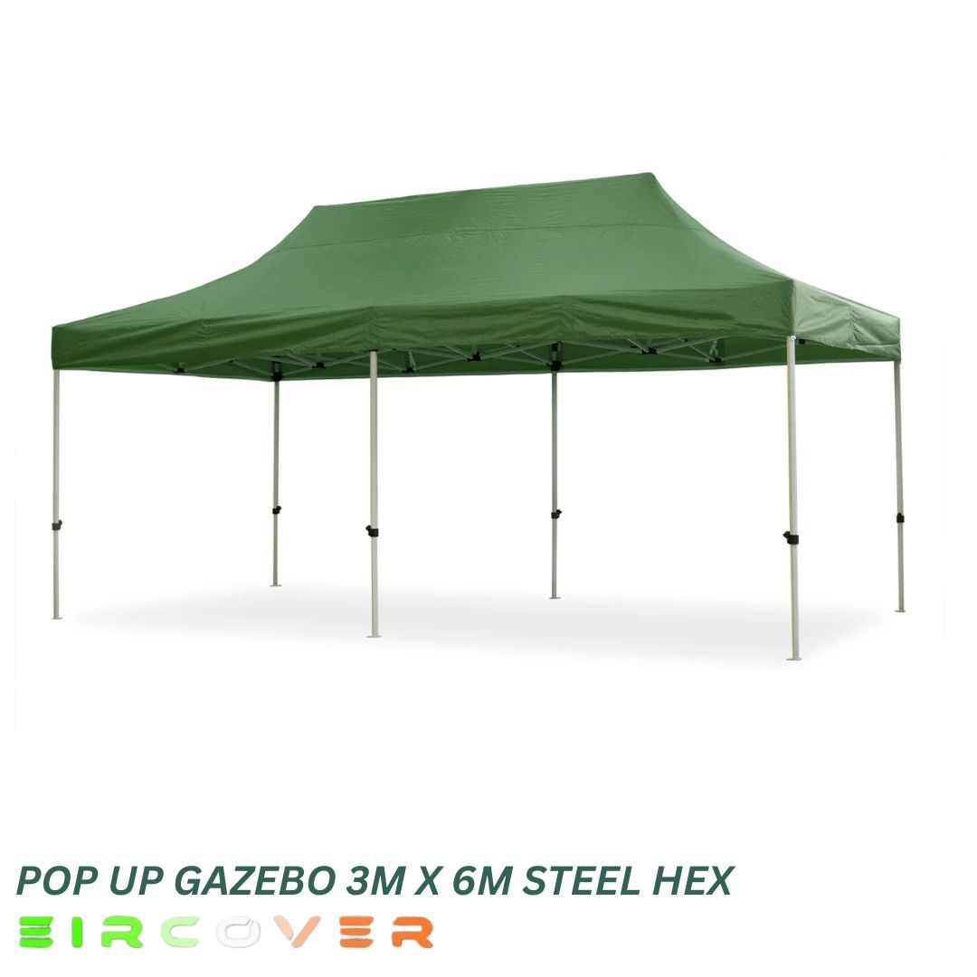 The 3m x 6m (10ft by 20ft) Steel Hex Pop Up Gazebo is a strong and reliable outdoor shelter designed for events, markets, and garden use. Built with a reinforced hexagonal steel frame and premium 420D Oxford PVC coated canopy, it delivers excellent protection against Irish weather conditions.